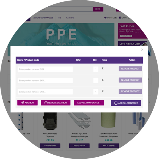 | Fast OrderOrdering has never been easier thanks to our new Fast Order. Fast Order only shows for users who are logged in. Once you’ve logged in, simply click on Fast Order at the top right. From here you can very quickly search for products and select the quantity that you need. Once you’re done, you can then add them all to your basket or order list. |  |
